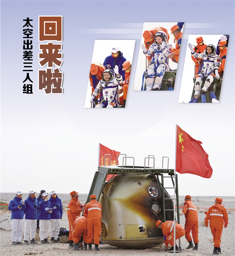 北京时间4月16日9时56分,神舟十三号载人飞船返回舱在阿拉善盟额济纳旗赛汉陶来苏木界内的东风着陆场成功着陆。在空间站执行飞行任务半年之久的航天员翟志刚、王亚平、叶光富安全顺利出舱,“太空出差三人组”向迎接他们的人群挥手致意。这片广袤无垠的沙漠戈壁,见证了神舟十三号载人飞船的出征和凯旋,也记录了中国载人航天事业一段“感觉良好”的铿锵步伐。(相关报道见8~9版)
