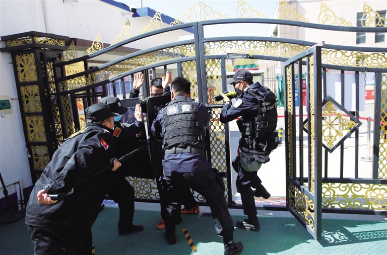 4月15日上午,包头市石拐区公安分局反恐怖和特巡警大队在石拐区润德幼儿园开展了一场反恐应急处突演练,一名男子模拟暴恐分子持器械强行闯入幼儿园袭击师生,幼儿园安保人员拉响警铃并拨打110电话报警,石拐区分局反恐怖和特巡警大队立即启动应急预案赶赴现场,外围组实施警戒,突击组实施抓捕(如图),成功将“暴恐分子”制服。演练结束后,特警们对师生开展了应急处突演练培训,现场演示徒手防卫与控制等技战术。文·摄影/北方新报正北方网记者 解裕涛