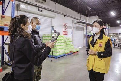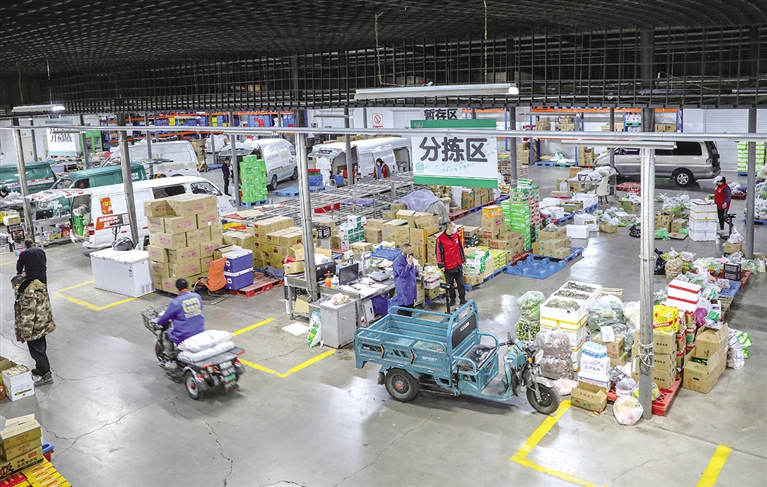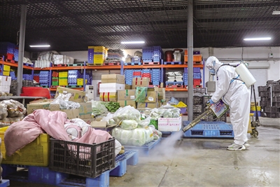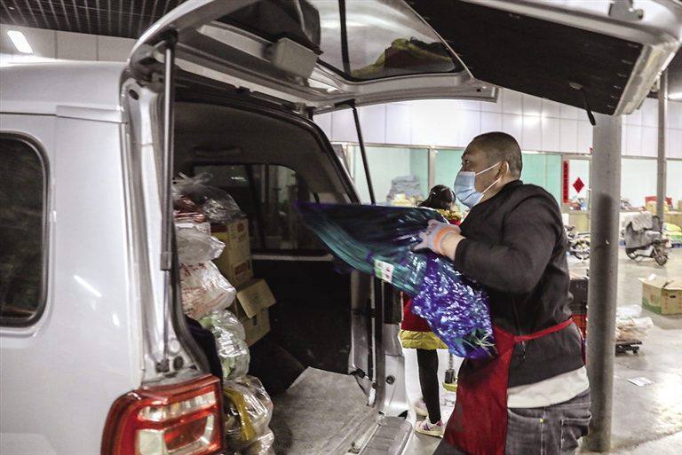记者看到,配送中心每位工作人员均规范佩戴口罩、一次性手套,每个商户都准备了消毒水,给开进来的货车仔细消毒,商户们打包、搬运、装车,忙碌中井然有序。