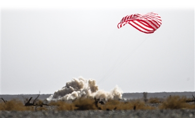 9时56分,返回舱成功着陆,如烟的尘土在戈壁滩上腾起数米之高。
