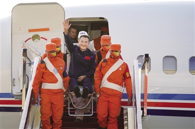 在医监医保人员的帮助下,翟志刚首先出舱,坐上地面人员为其准备的航天员专用座椅。他面带微笑,表示感觉非常良好,并向祖国和人民报告,圆满完成任务。
