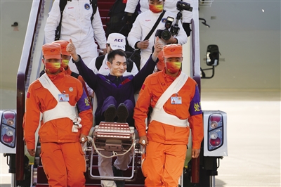 首次飞天的叶光富最后出舱,面对人群做了个“点赞”“比心”的手势。他在接受采访时表示:实现了飞天梦想,可以自豪地向祖国报到!