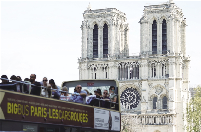 4月15日,一辆旅游观光大巴经过法国巴黎圣母院附近。15日是法国巴黎圣母院遭大火烧损三周年纪念日。法国总统马克龙当天视察巴黎圣母院重建施工现场后表示,巴黎圣母院有望在2024年对游客重新开放。马克龙说,目前施工进展顺利,各个团队夜以继日地工作。