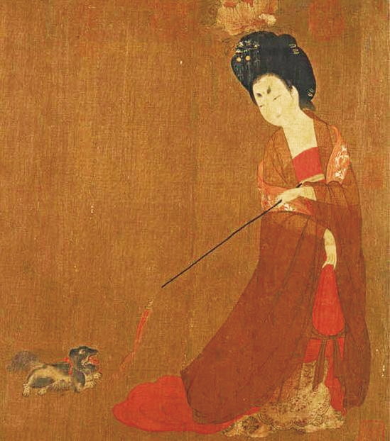 至于女子的服饰,那就更多彩了。“单衫杏子红”,大概是橘红色;“缣罗不著索轻容,对面教人染退红”,大概是浅红色;“记得绿罗裙,处处怜芳草”,则是草一样的碧绿色。不过,在所有的色彩中,石榴色可能是女子最钟情的颜色。据说,石榴色是血红的颜色,是由石榴花染成的色,这种颜色的裙子就叫石榴裙,梁元帝有诗曰:“交龙成锦斗凤纹,芙蓉为带石榴裙。”女皇武则天也写过一首诗:“看朱成碧思纷纷,憔悴支离为忆君。不信比来常下泪,开箱验取石榴裙。”在关于唐代石榴裙的传说中,还有一个典故:据传天宝年间,文官众臣因唐明皇之令,凡见到杨贵妃须行跪拜礼,而杨贵妃平日又喜欢穿着石榴裙,于是“跪拜在石榴裙下”成为了崇拜敬慕女性的俗语。
