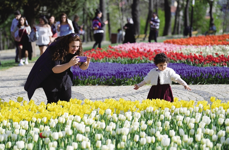 4月15日,游客在土耳其伊斯坦布尔的埃米尔甘公园内用手机拍摄郁金香。摄影/新华社记者 沙达提