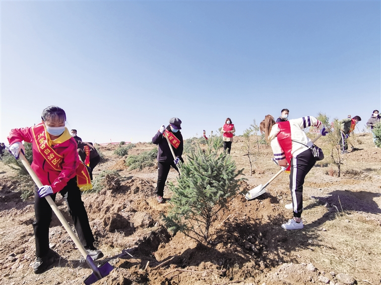 在赛罕区西五十家村“劳模林”植树现场,劳模们干劲十足。大家挥动着铁锹,扶树苗、培土、浇水,配合默契,经过两个多小时的辛勤劳动,新种的松树苗整齐排列,在春风中展现出勃勃生机。