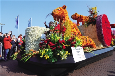 4月23日,在荷兰诺德韦克市,海牙中国文化中心的花车参加花车巡游。当日,荷兰花车巡游从西部小城诺德韦克市开始,行程约40公里,途经多个城镇。受疫情影响,这项花车巡游活动暂停了两个春季,今年终于重启,主题为“欢庆回忆”。在花车巡游队伍中,海牙中国文化中心用约2万枝鲜花装饰了两组花车造型,庆祝中国和荷兰建交50周年,并向荷兰公众展示中国的虎年生肖文化。摄影/新华社记者 郑焕松