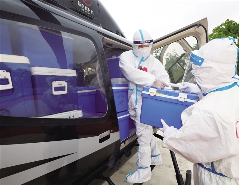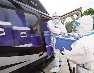 24日,一架运送2万管核酸检测样本的直升机从上海松江区巨人基地飞往安徽滁州市。为加快核酸筛查,缓解上海核酸检测压力,上海新空直升机公司从4月10日开始,无偿将上海市部分核酸检测样本运往临近上海市的江苏、浙江和安徽的一些城市进行检测。到目前为止,已运送核酸检测样本超过25万管。摄影/新华社记者 陈建力