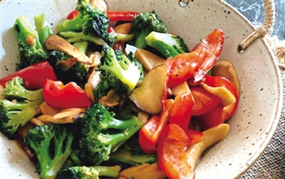 3.锅中放少量橄榄油,放适量姜、蒜,炒香后放杏鲍菇,炒至轻微变色后放西蓝花,最后放彩椒,翻炒大约不到1分钟后放料汁,简单收汁后撒些黑胡椒即可出锅。