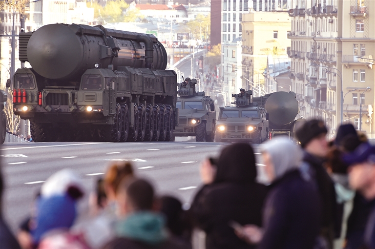 5月4日,在莫斯科,参加阅兵活动彩排的军用车辆从市区驶过。俄罗斯国防部长绍伊古在4日召开的电话会议上说,纪念卫国战争胜利77周年的阅兵活动将于5月9日在俄罗斯28个城市举行,约有6.5万人、2400余种军事装备和460多架飞机参与阅兵。(据新华社报道)