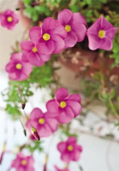酢浆草,别名亦叫三叶草、酸浆草等,系多年生草本植物。能如油菜般结满胀鼓鼓的小果荚。酢浆草有多种花色,以红、黄两色为常见,喜向阳、温暖、湿润的环境。我家阳台上的那些酢浆草不是我种的,是“自来的”,种子不知来自何方,不知怎么就落在绿植盆中,自生自长,生命力很顽强。本以为是野草想拔掉,但它们长得又快又多,而且模样不难看,于是就留下了它们。看着它们萌芽、长叶、开花、结籽,那一大团很干净的绿色,十分养眼。