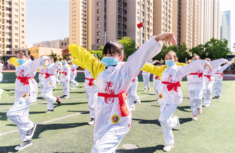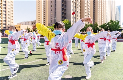 5月16日,呼和浩特市玉泉区恒昌店巷小学五里营校区的学生们在体育课上练习“五禽戏”。近年来,该校将健身气功“五禽戏”作为特色体育项目引进校园,通过练习,让学生们在强健体魄的同时,传承中华优秀传统文化。