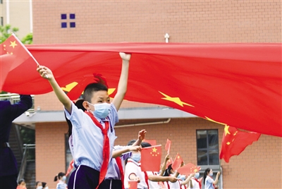 5月20日上午,呼和浩特市绿地小学腾飞路校区,一面天安门广场专用国旗在学生们的头顶手手相传,大家争先触摸这面特殊而珍贵的国旗。当天,内蒙古自治区“我们都是中国娃”迎六一升国旗主题活动在该校区举行。“这面国旗长5米、宽3.3米,是用特殊材料制成的,不管阳光怎样照射都永不褪色,同时防水性非常好……”北京天安门国旗班第一任班长、被中央军委授予“国旗卫士”荣誉称号的董立敢现场讲述了国旗的象征和意义等知识。