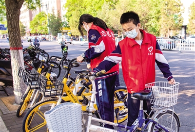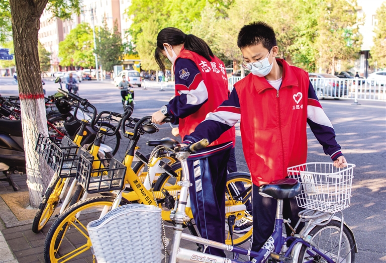 5月23日,呼和浩特市第二十六中学的学生志愿者来到校园周边的共享单车、自行车停放点,将车辆摆放整齐。据了解,近年来,该校学生志愿者坚持对校园周边的自行车进行统一规范摆放,清理车筐内残留的垃圾,维护整洁有序的公共环境。