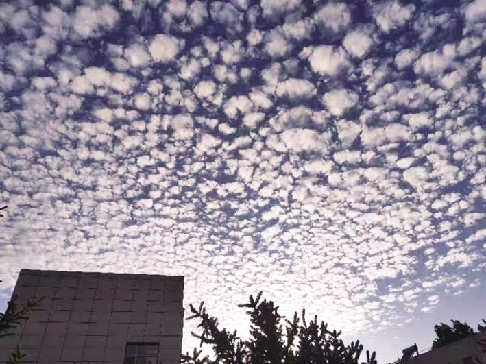 据乌拉特中旗气象局工作人员贾月涛介绍,透光高积云一般呈现波状、絮状或鱼鳞状。主要是在3000~5000米左右的空中有较为稳定而湿润的空气发生波动所形成。云体有时分散孤立,有时聚集成群、成行,如同田垄或波浪。薄的高积云稳定少变,一般预示天晴;厚的高积云如继续增厚,预示可能有弱降水出现。