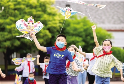 5月31日,呼和浩特市玉泉区五塔寺东街小学学生在校园操场上放飞风筝。当日,该校开展了“放飞纸鸢迎端午”主题教育活动,让孩子们在民俗体验活动中,感受中华传统节日的魅力,迎接端午节的到来。