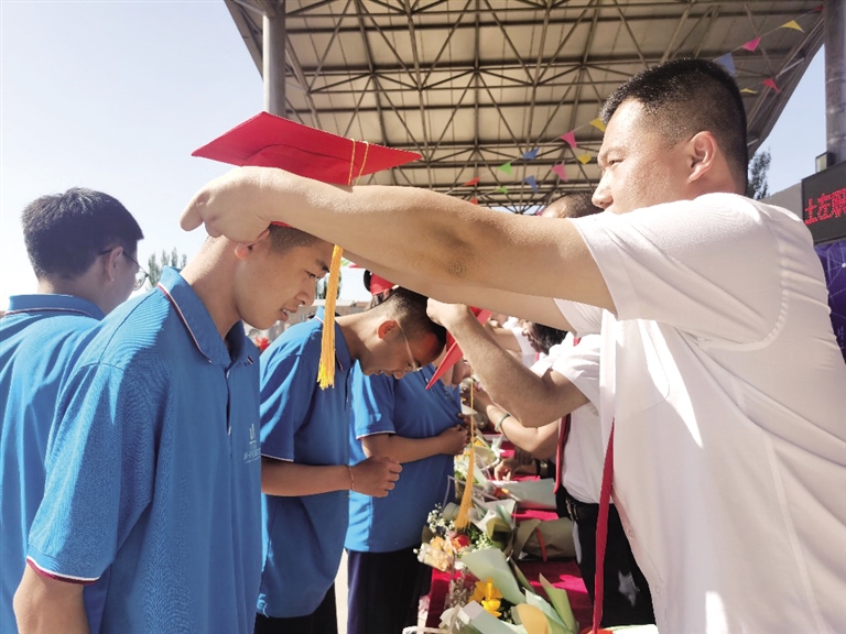 6月1日,老师为学生佩戴成人冠。当日,土左旗第一职业中学举行2022年毕业典礼、成人礼暨师生表彰及学生奖学金发放仪式,全校1300多名师生共同见证了这一时刻。高二的学生们步入18岁,意味着长大与成人,意味着独立与自强,意味着责任与担当,他们的人生翻开崭新的篇章。摄影/北方新报正北方网记者 郑慧英