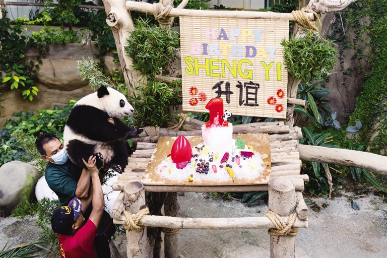 5月31日,在马来西亚出生的大熊猫宝宝“升谊”在马来西亚吉隆坡附近的国家动物园庆祝一岁生日。“升谊”是中国旅马大熊猫“兴兴”和“靓靓”生下的第三只宝宝,出生于2021年5月31日中马建交47周年纪念日当天。摄影/新华社记者 朱 炜