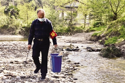 清晨,伴着清亮动听的溪流声,汉水源村护林员张仕明手拿扫帚,把石板步道上的落叶扫得干干净净。