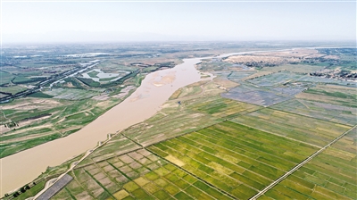 绿意盎然的黄河两岸(无人机照片)。夏日里,黄河宁夏段河道两岸,稻田、滩涂绿意盎然,给黄河带来勃勃生机与生态之美。摄影/新华社记者 王 鹏