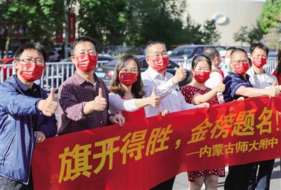 “加油!”“别紧张,正常发挥就好……”6月7日8时许,在呼和浩特市第一中学和第八中学门口,由一中高三班主任和任课老师组成的庞大送考团拉着写有“旗开得胜 一鸣惊人”字样的横幅,一一和学生们击掌,为学生加油打气。