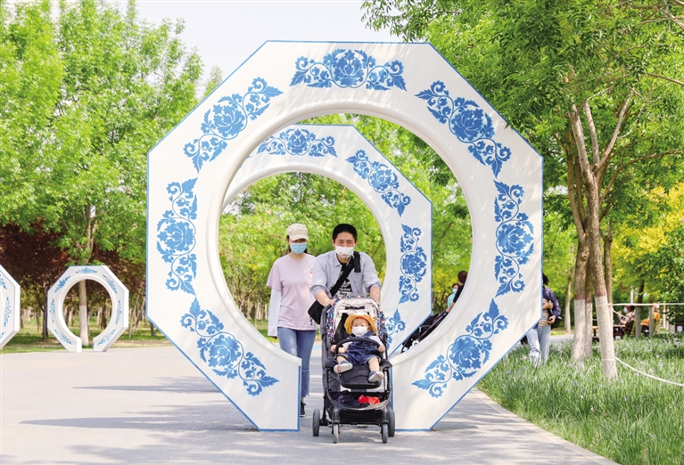 6月8日,一家三口在丝绸之路文化公园欣赏美景。夏日的呼和浩特,满眼青翠,在各大公园内,市民们尽享夏日美好时光。 摄影/北方新报正北方网首席记者 牛天甲