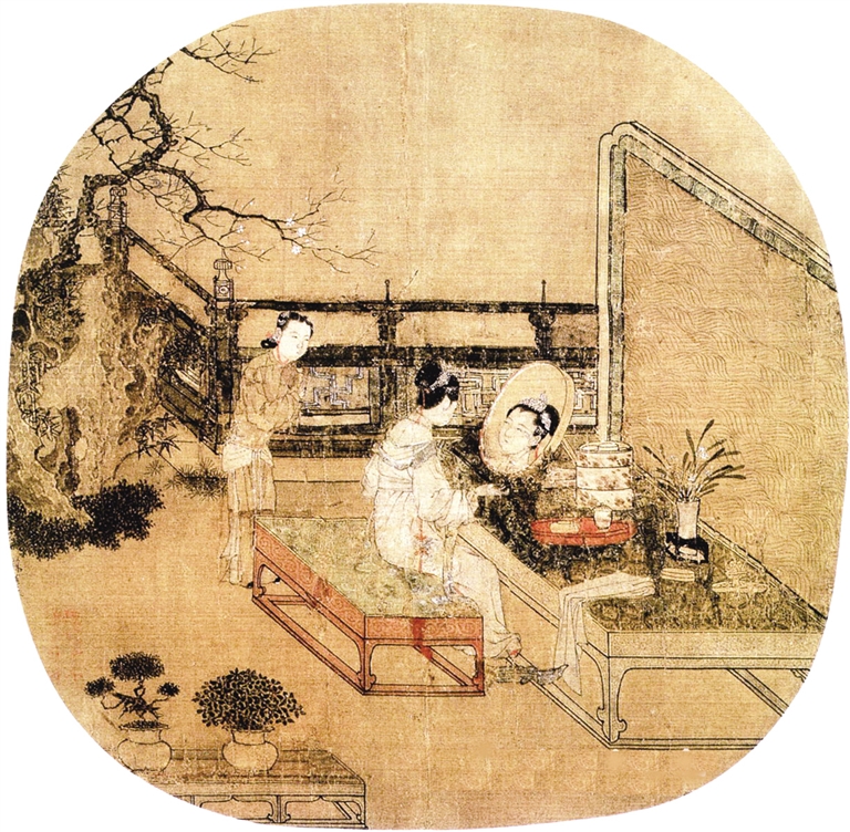 与唐代女性以胖为美相反,宋代女性以瘦为美。以苏汉臣的《妆靓仕女图》、钱选的《招凉仕女图》为例,画中的宋代女性流行削肩、平胸、柳腰、纤足。这些画中的仕女,穿的服饰给身材起到了修饰作用,整个人被拉得“长、窄、直”,加上溜肩的效果,仕女们看起来娇柔纤细,弱不禁风。
