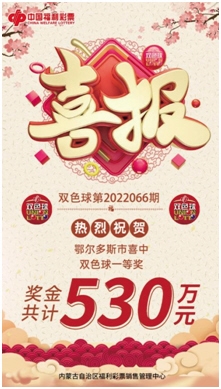 6月12日,双色球游戏第2022066期开奖,当期双色球头奖开出33注,单注奖金为515万多元,这33注一等奖花落15地。其中一注双色球头奖喜降我区鄂尔多斯市,中奖彩票是一张复式自选票,中出当期双色球头奖1注,二等奖1注及其他若干奖级,总奖金530万元。