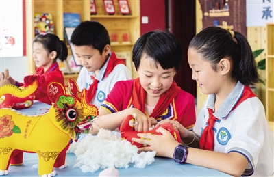 6月16日,呼和浩特市玉泉区南柴火市街小学学生在缝制布老虎。据了解,近年来,该校积极推进“传统文化进校园”,将布老虎、剪纸、皮艺等项目引入到课程中,通过特色课堂、作品展览、培训体验和教育传习等活动,推动非遗项目与学校教育有机结合,让学生在实操体验中感受非遗技艺的魅力,促进中华传统文化的保护和传承。摄影/北方新报正北方网首席记者 牛天甲
