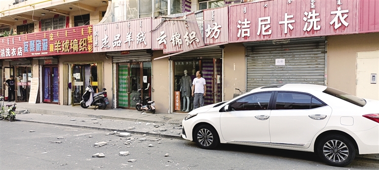 被砸车辆车主白先生告诉记者,他在17号楼底店开了间理发店,当时刚把车停好,进屋就听到一声巨响,出去一看,脱落的墙体将车的右前机盖砸出一个直径10厘米的坑,右前大灯被砸裂。白先生心有余悸地说:“还好有二楼的平台挡了一下,要是直接砸下来,车就毁了。”事发后,白先生拨打了报警电话,经过汽车维修店定损,维修费要800多元。他希望有关部门能赔偿维修车辆的损失。