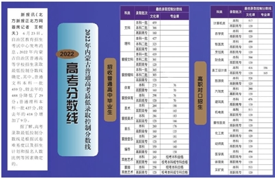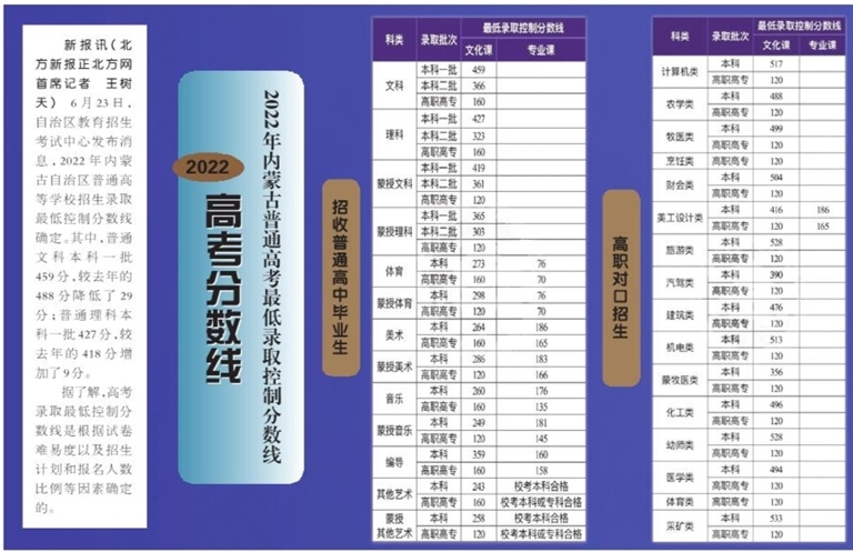 新报讯(北方新报正北方网首席记者 王树天) 6月23日,自治区教育招生考试中心发布消息,2022年内蒙古自治区普通高等学校招生录取最低控制分数线确定。其中,普通文科本科一批459分,较去年的488分降低了29分;普通理科本科一批427分,较去年的418分增加了9分。