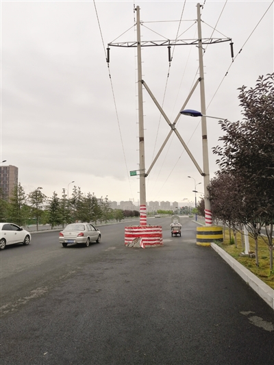 负责该路段清洁工作的一位环卫工人告诉记者,该路段是于去年秋天完成第二次沥青铺轧的。从道路开始建设到完成第二次铺油,这两根高压电线杆始终矗立在这个位置。从他开始负责该路段的清洁工作开始,就已经四五次见到有机动车撞到水泥桩上了,有时候是白天,有时候是晚上。