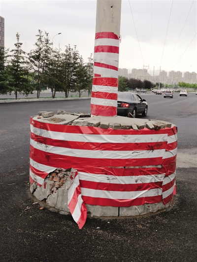 靠近绿化带的电线杆,底部的水泥桩直径较小,上面用黄黑色油漆刷出了警示条纹。另一根电线杆矗立在机动车道上,电线杆底部的水泥桩用红白相间的塑料条包裹出警示条纹,电线杆上的绿色标牌上写有“110KV昭中线061#”字样。这个水泥桩上可以明显看到被撞击损坏的痕迹,警示条也有多处破损(如图)。