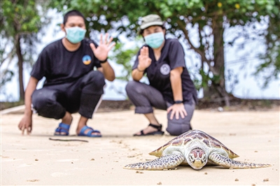 近日,在泰国罗勇府蒙奈岛海龟保护中心,南塔日卡博士(右)和同事将海龟放归自然。朱拉隆功大学水生动物研究中心主任南塔日卡博士是泰国知名水生动物专家,从业30余年来已累计救治龟类至少25000只,并帮助它们重返自然。2014年南塔日卡博士获颁“泰国杰出女性奖”,她说:“在她眼中,所有生命都值得被拯救。”摄影/新华社记者 王 腾