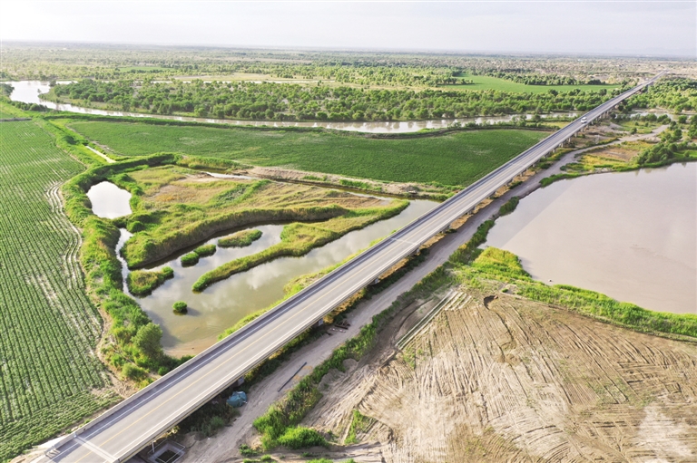 尉犁至且末沙漠公路位于新疆巴音郭楞蒙古自治州境内,全长334公里,是目前世界上流动沙丘分布最广、施工条件最恶劣、施工难度最大的沙漠公路之一。图为尉犁至且末沙漠公路穿越塔里木河和胡杨林(6月22日摄)。摄影/新华社记者 李 响