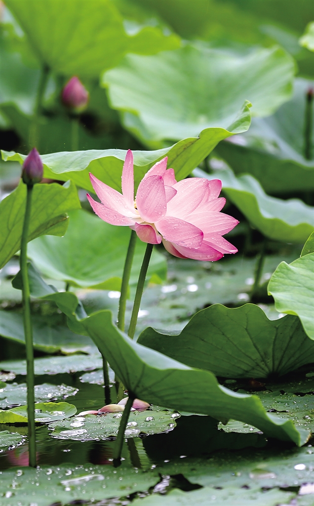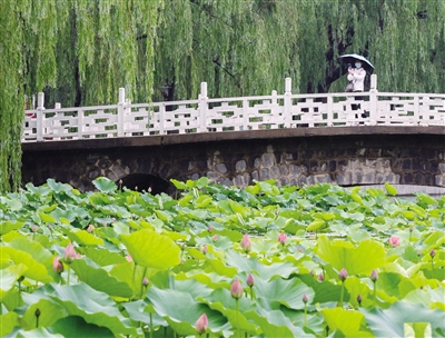 7月5日上午,一位市民冒雨观赏荷花。当日,呼和浩特市迎来降雨,不少市民来到满都海公园,在清新的空气中观赏雨中荷花,别有一番韵味。摄影/北方新报正北方网首席记者 牛天甲