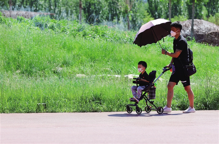 日前,在呼和浩特市小草公园,一名市民带娃漫步“城中草原”。可踩踏草坪、昆虫旅馆、小鸟驿站……记者看到,这里集合了低碳环保、智慧科技、自然科普等元素,是一个贴近自然、寓教于乐的休憩佳地。(相关报道见5版)