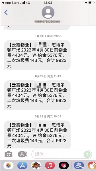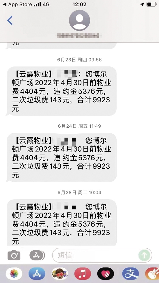 7月5日,记者来到位于呼和浩特市赛罕区展东路与乌兰察布东街交叉口的博尔顿广场,博尔顿广场分A、B、C、D、E、F座公寓,共有1300多户业主。业主张女士拿出手机短信指给记者看:“内蒙古云霞物业服务有限公司(以下简称云霞物业)天天催,除高昂的物业费,还有高昂违约金。问题是云霞物业早在去年合同就到期了。如今,新进场的物业公司也在催要物业费。那业主的物业费到底该交给谁?”