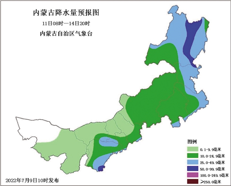 据气象预报,7月11~14日,内蒙古大部有降水,巴彦淖尔市东南部、鄂尔多斯市大部、包头市南部、呼和浩特市中部和南部、乌兰察布市南部、锡林郭勒盟大部、赤峰市、通辽市、兴安盟、呼伦贝尔市累计降水量10.0~24.9毫米;巴彦淖尔市东南部部分地区、鄂尔多斯市北部和东南部、包头市南部部分地区、赤峰市南部、通辽市中部和东部、兴安盟东部、呼伦贝尔市北部和东部累计降水量25.0~49.9毫米;鄂尔多斯市东南部部分地区、兴安盟东北部部分地区、呼伦贝尔市东部部分地区累计降水量超过50.0毫米,并伴有短时强降水、雷暴大风、冰雹等强对流天气。