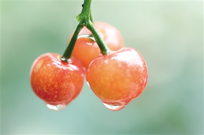 夏天的味道,从一颗莹莹可爱的樱桃开始。樱桃的种植历史可追溯春秋时期,《礼记》中已有“仲夏之日以会桃先荐寝庙”的记载。樱桃以其婀娜玲珑的身姿、娇艳光洁的色泽、甜酸适中的口感,深受众人喜爱。白居易曾写过一首《吴樱桃》,记录他在亲历樱桃熟时的所见所闻:“香色鲜浓气味殊”引众人纷纷前往采摘,硕果累累的樱桃园一派“鸟偷飞处衔将火,人摘争时蹋破珠”的热闹景象。与白居易借樱桃感叹自身机遇相比,杜牧则是被樱桃的味道深深吸引,不仅盛赞“新果真琼液,未应宴紫兰”,更发出“流年如可驻,何必九华丹”的赞叹,樱桃的美味连九华仙丹都不可比,可谓挚爱。宋代诗人杨万里也是樱桃的“真爱粉”,他不仅写过七言绝句《樱桃》,记录采摘樱桃后小心翼翼、十分珍爱的心情,更以一道名曰“樱桃煎”的美味入诗,记录下樱桃蜜饯的做法:“何人弄好手?万颗捣虚脆。印成花钿薄,染作水澌紫。”只因“北果非不多,此味良独美”。