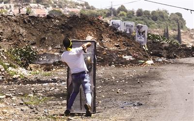 7月15日,在约旦河西岸城市纳布卢斯附近的村庄,一名巴勒斯坦抗议者手持自制防护器具与手持防暴盾牌的以色列士兵对峙。 (据新华社报道)