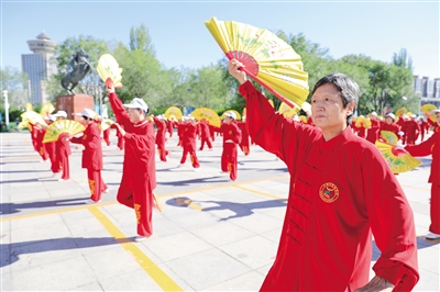 7月18日,健身气功爱好者在进行展示。当日,内蒙古自治区第七届百县健身气功、太极拳(剑)交流比赛开幕式暨全国百城千村(内蒙古百城)健身气功交流展示活动启动仪式在内蒙古赛马场举行。据了解,本次活动包括两个大项14个小项,近2000余名爱好者参加。截至2021年底,内蒙古共设立健身气功站点1700余个,经常习练群众近14万人。