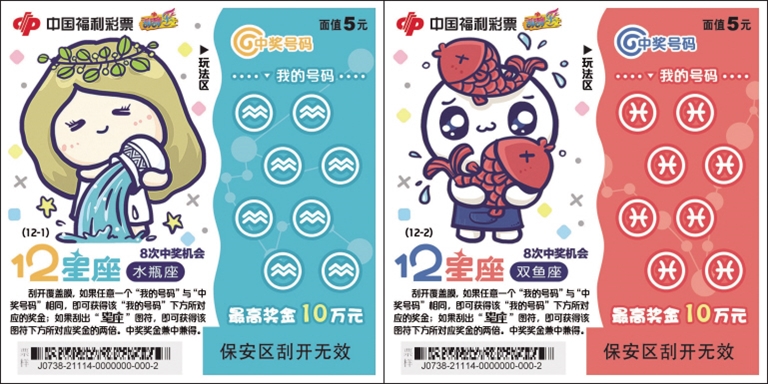 刮刮乐“12星座”面值5元,最高奖金10万元。票面是以“12星座”为主题而设计的一款12联票。票面分别采用12星座各具特色的卡通形象,各种糖果色搭配白色,设计风格简约,色彩清新靓丽。而在玩法区,则采用了异形设计,图案采用相应星座代表符号,与画面风格相呼应。