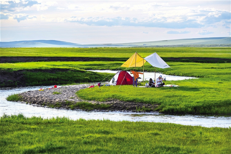 7月19日,游客在西乌珠穆沁旗巴拉嘎尔河畔露营。夏日,锡林郭勒盟西乌珠穆沁旗的草原绿草如茵,风光旖旎。 摄影/新华社记者 彭 源