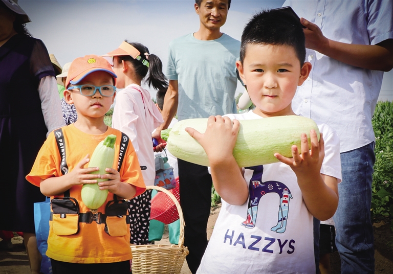 7月19日,两个小朋友抱着自己采摘的角瓜。当日下午,呼和浩特市赛罕区蒙古族幼儿园六犋牛分园举办了农耕文化节主题活动。收藏家李兰柱现场展示了其收藏的各种农具,让小朋友们充分了解农具的发展历程。通过丰富多彩的体验活动,钩织、剪纸、泥塑、手工割麦、实地采摘、食物制作等,让小朋友们感受劳动的乐趣。 文·摄影/北方新报正北方网首席记者 王树天 实习生 王 睿