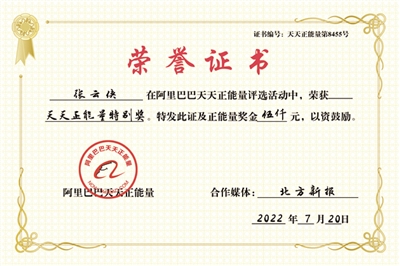 7月20日,一直致力于挖掘和传播正能量故事的阿里巴巴“天天正能量”通过本报了解到张云侠的故事后,决定联合本报授予张云侠天天正能量特别奖和5000元奖金。阿里巴巴“天天正能量”在颁奖词中写道:丈夫身患重病不幸离世,留给这位弱女子的不仅是丧夫之痛,还有一张长长的60万账单。悲痛与重压之下,她硬生生靠勤劳和诚信撑起自家修理店。修农机、卖配件、整理工具……慢慢从“小白”变成“行家”。9年来,单薄的身影像陀螺一样旋转不停,终于还清所有债务,诠释了这段“一诺千金”的诚信佳话。柔肩挑重担,巧手破万难!“她”的力量扛起一片天。一份奖励,致敬诚信担当!