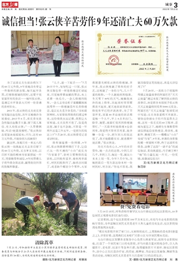 诚信担当! 张云侠辛苦劳作9年还清亡夫60万欠款