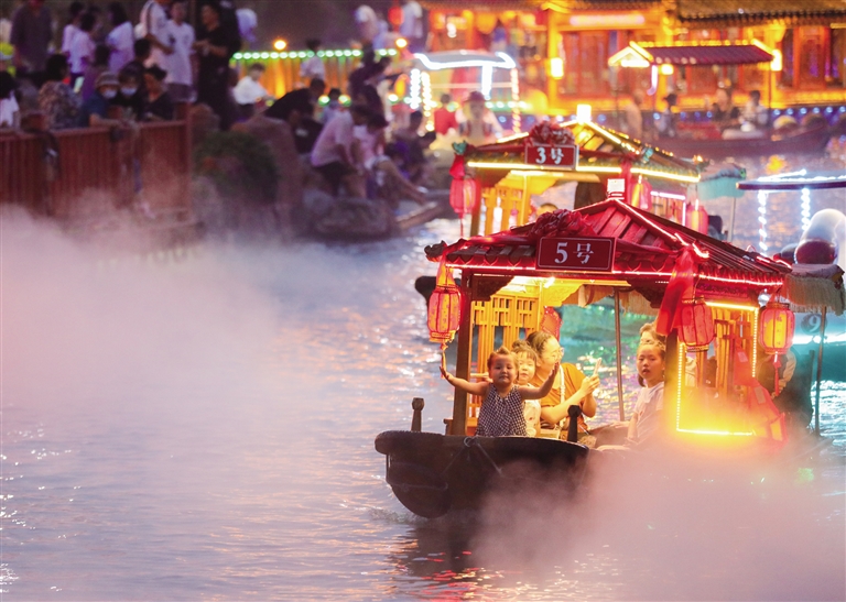 灯光闪闪的摩天轮、五颜六色的霓虹灯、踏雾而来的游船……7月21日,暮色四合,华灯初上,呼和浩特市恼包村是另一番人间烟火。这里的夜经济不断释放活力,丰富群众文化生活。