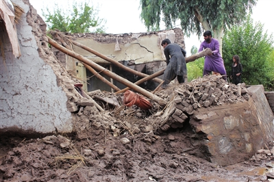 这是在阿富汗楠格哈尔省受灾地区拍摄的受损房屋。阿富汗东部楠格哈尔省省长办公室25日发布声明说,该省首府贾拉拉巴德及周边部分地区24日晚发生洪水,造成5人死亡、10人受伤。 (据新华社报道)