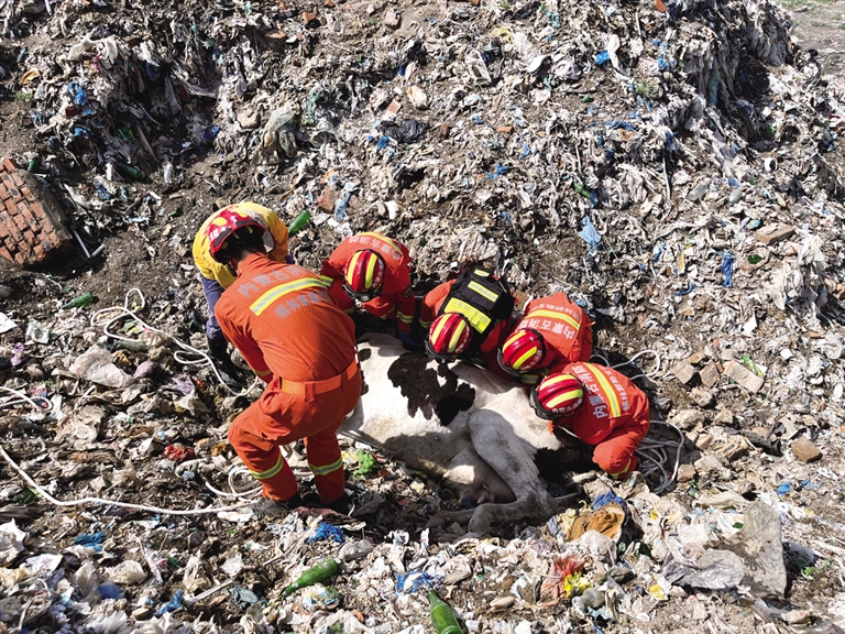 消防救援人员到场后发现,现场为垃圾填埋点,垃圾堆下“掩埋”着一头奶牛。经询问牛主人得知,被困奶牛体长约1.5米,体重约400斤,因雨后泥土松软,一脚踏空跌入垃圾坑。根据现场情况,一名消防员用绳索将牛固定,防止其乱动,随后通过多人拖拽的方式,用时近20分钟将被困奶牛救出。